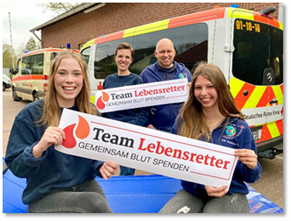 Reinbek, 27.4.2022 – Teamgeist, soziales Engagement, Vorbild sein für andere Menschen: all das sind Werte, die in den Verbänden des Deutschen Roten Kreuzes großgeschrieben werden. Beim Jugendrotkreuz Reinbek im Kreis Stormarn zeigen die Gruppenleiter Anja und Sönke Rieck und ihre „Schützlinge“ Sarah Nielsson und Shanya Pathak jetzt, wie diese Werte auf perfekte Art und Weise mit Leben gefüllt werden. Ende April kamen die vier zur jüngsten DRK-Blutspendeaktion ins Reinbeker DRK-Zentrum am Birkenweg. Die Aktion des DRK-Blutspendedienstes „Team Lebensretter – Gemeinsam Blut spenden“ war der Anlass für die beiden gerade 18 Jahre alten Jugendrotkreuzlerinnen Sarah und Shanya, den Vorbildern ihrer Gruppenleiter Anja und Sönke zu folgen. Die Riecks sind nicht nur bereits seit ihrer eigenen Jugend im Roten Kreuz engagiert, sie sind auch beide langjährige Blutspender. Viel Überzeugungsarbeit mussten sie bei den beiden Mitgliedern ihrer JRK-Gruppe der „Knopfnasen“ allerdings gar nicht mehr leisten. Sarah und Shanya sind im Jugendrotkreuz, seit sie Zweitklässlerinnen sind. Die lebenswichtige Bedeutung des Blutspendens ist ihnen seit Langem bewusst. „Wenn man dann 18 Jahre alt ist, dann möchte man auch endlich selber spenden und damit helfen. Anja und Sönke haben in unserer Gruppe bereits früh über das Thema Blutspende informiert. Und jetzt gemeinsam im Team macht es natürlich noch mehr Spaß als allein“, findet Sarah Nielsson. „Wir wollen jetzt nach unserer Spende-Premiere auf jeden Fall regelmäßig weiter Blut spenden“, ergänzt Shanya Pathak.